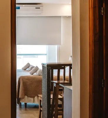 Cuenta con cama matrimonial o individual, barra desayunadora con banquetas y un mobiliario simple pero funcional. La cocina equipada incluye vajilla básica, pava eléctrica, microondas y heladera con freezer, para que puedas resolver tus comidas con total comodidad.