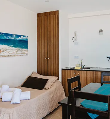 Con capacidad para hasta cuatro personas, cuenta con un dormitorio privado (con cama matrimonial o dos individuales) y un living con cama marinera, mesa con sillas y salida a un amplio balcón con vista al mar, equipado con mesa y sillas para disfrutar al aire libre.